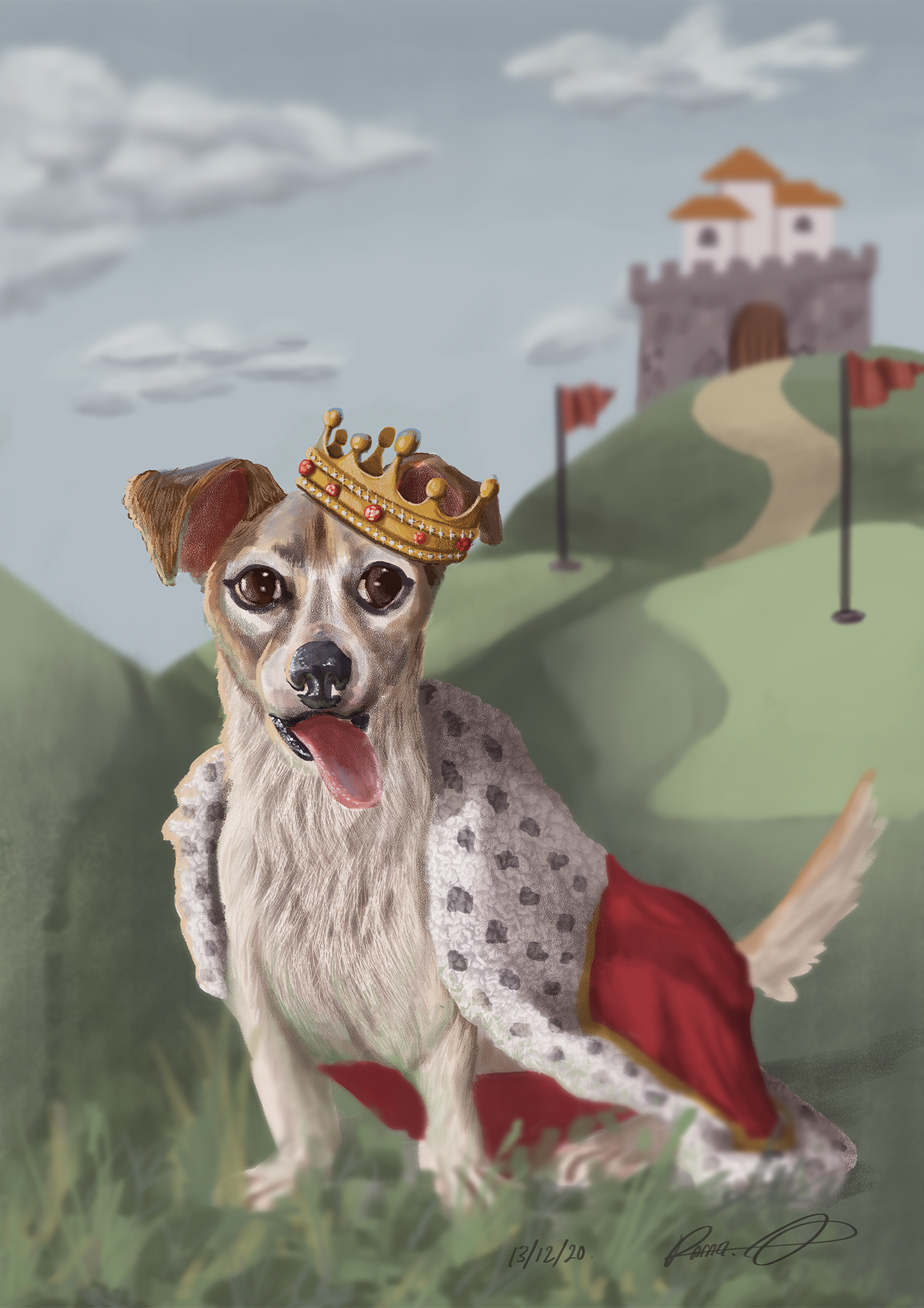 Toby the king of his castle. Commissioned as a gift for their grandmother. A digital piece of her favourite companion.